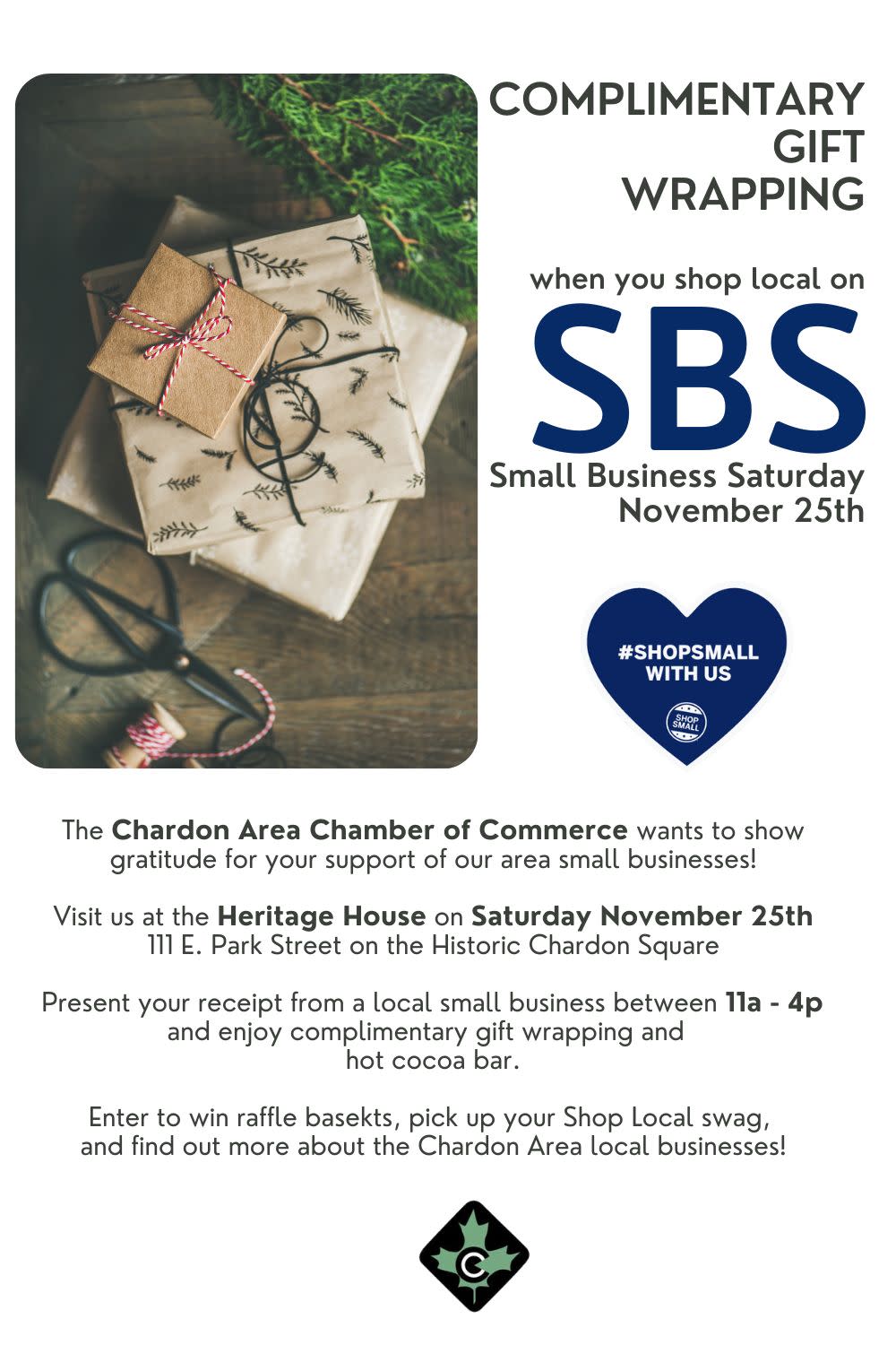 - The Chardon Area Chamber of Commerce will be stationed at the Heritage House (111 E. Park Street) between 11a - 4p offering complimentary gift wrapping for those that present proof of purchase from a local business. Warm up at our Hot Cocoa bar and take in festive music, a special holiday dance performance, raffles all while perusing promotional material from our members!