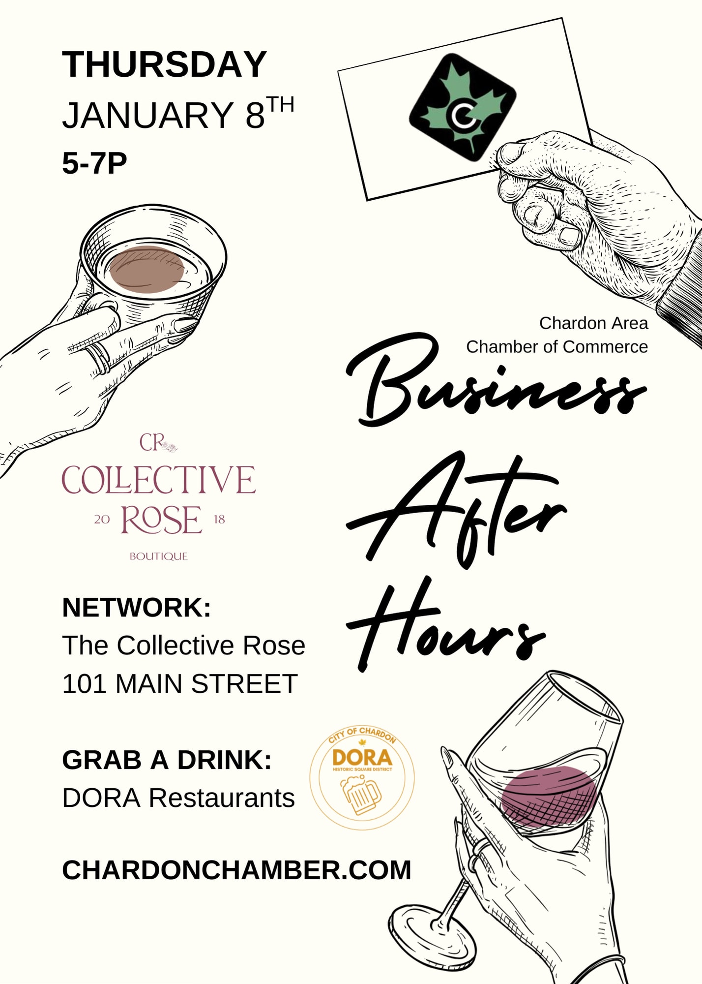 Join the Chardon Chamber for an exciting evening of Networking, Shopping with your host - The Collective Rose and Experiencing the City of Chardon D.O.R.A. (Designated Outdoor Refreshment Area) Program!