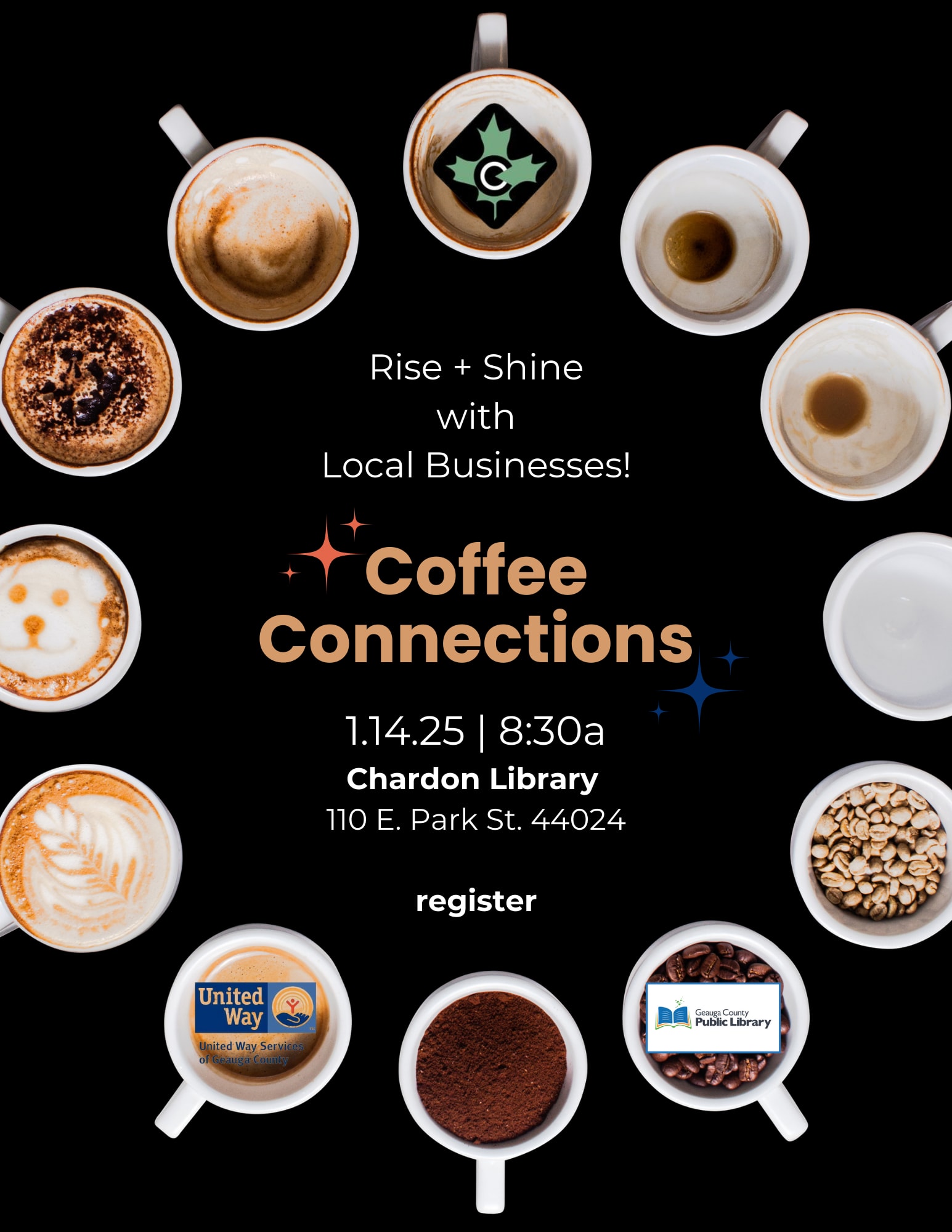 Looking forward to making connections this January? Kick off 2025 with the Chamber’s first Coffee Connections event! Hosted by United Way Services of Geauga County, this fun and casual networking gathering is the perfect opportunity to introduce yourself, share updates about your business or organization, and let others know what’s happening in your world. Take the spotlight to highlight your upcoming events, promotions, or other need-to-know details. Enjoy coffee, donuts, and a lively business-themed icebreaker to spark conversations. Plus, don’t miss your chance to win a gift certificate in our raffle! Join us at the Chardon Library—sign up today, and let’s start the year connecting and collaborating!Images