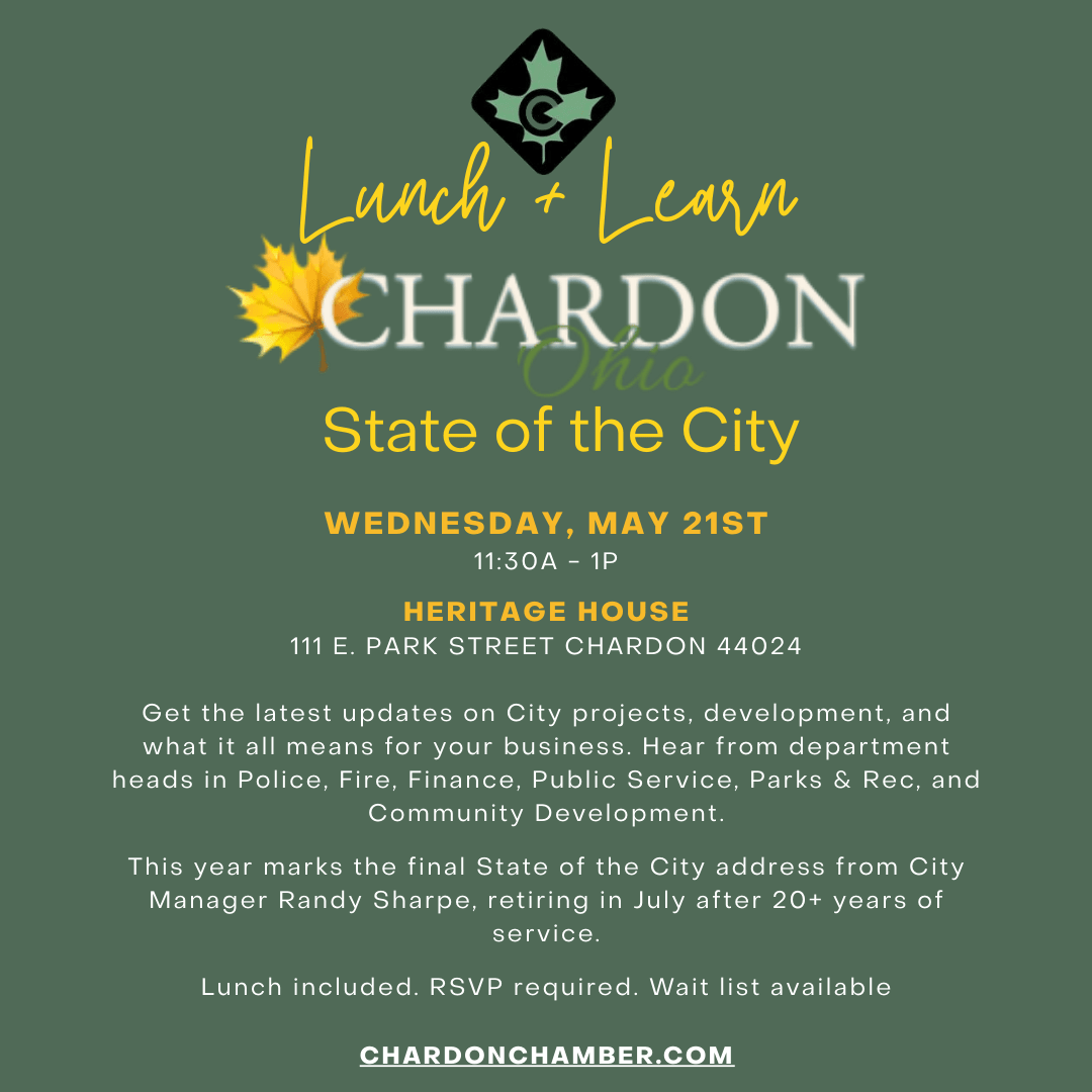 Join us for an inside look at the City of Chardon's growth, goals, and impact on local business at our May Lunch & Learn: State of the City event, presented in partnership with the City of Chardon.