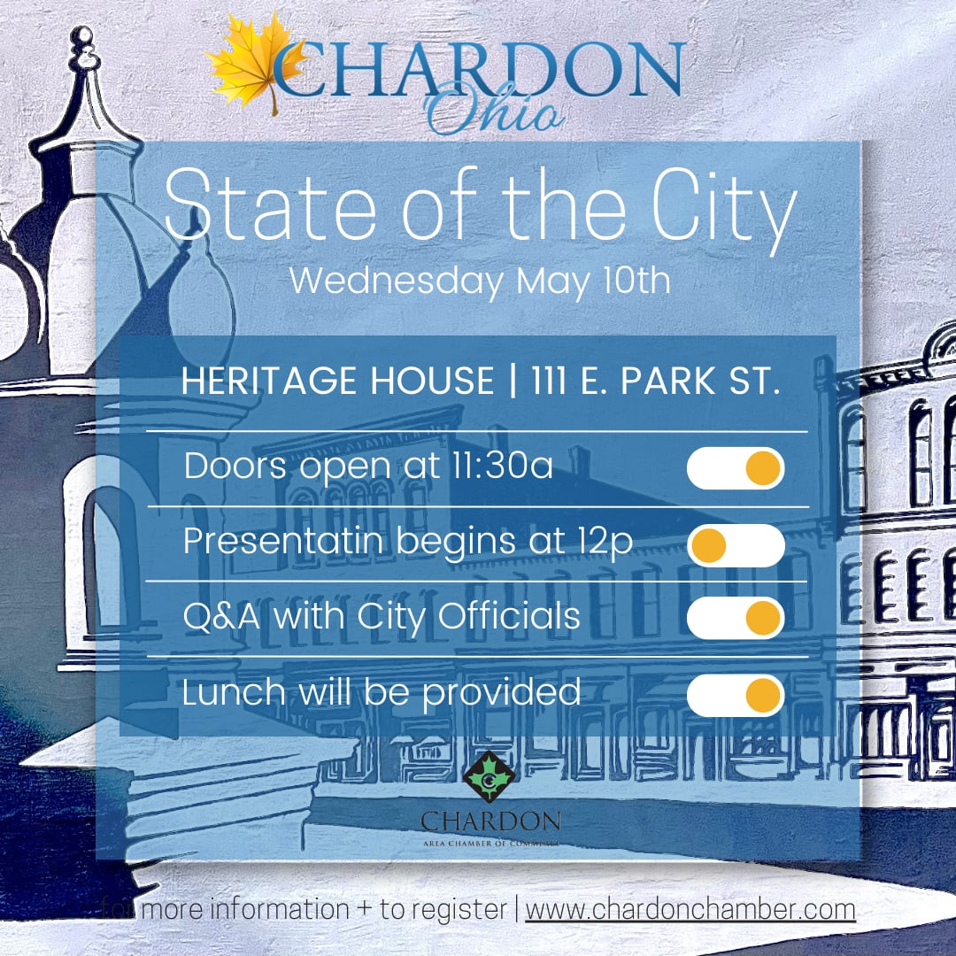 Join Chardon City Officials for a 2023 State of the City. Doors open at 11:30a for a half an hour of networking. The presentation will begin promptly at 12p and end at 1p. Lunch will be provided by Congin's. Registration is $20/person