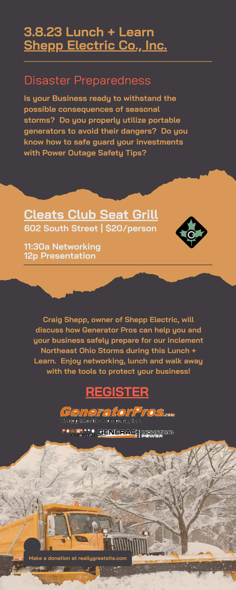 Craig Shepp, owner of Shepp Electric, will discuss how Generator Pros can help you and your business safely prepare for our inclement Northeast Ohio Storms during this informative Lunch + Learn. Enjoy networking, lunch, and walk away with the tools to protect your business! Doors open at 11:30a Presentation begins promptly at 12p 50/50 with proceeds going towards our Scholarship program + fun free raffle (bring your business card!)Images