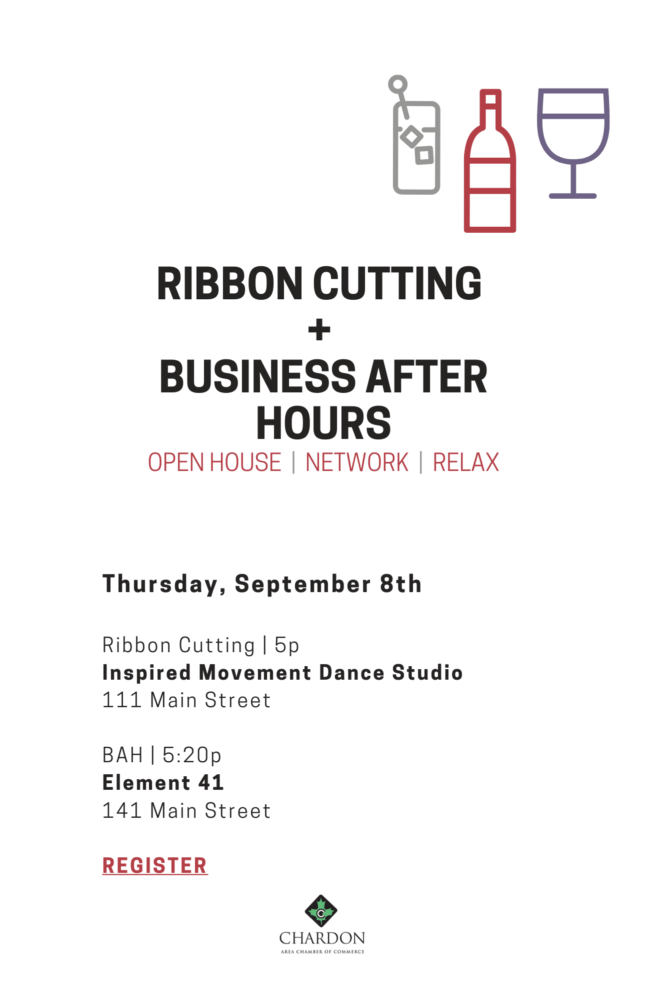 It's an after hours Ribbon Cutting with Inspired Movement Dance Studio (formerly Ballet Gloria)! Then join us as we move down the street to Element 41 to chat with fellow members, have a drink and a quick bite to eat. We encourage you to bring a colleague, friend, or anyone who may want to check out Element and find out more about the Chamber. See you there!