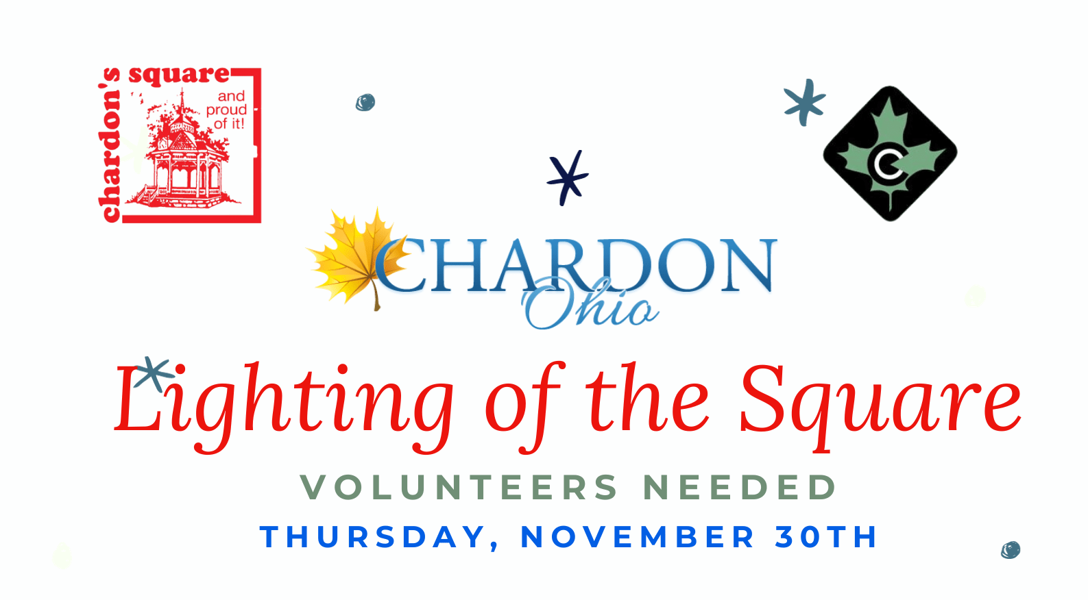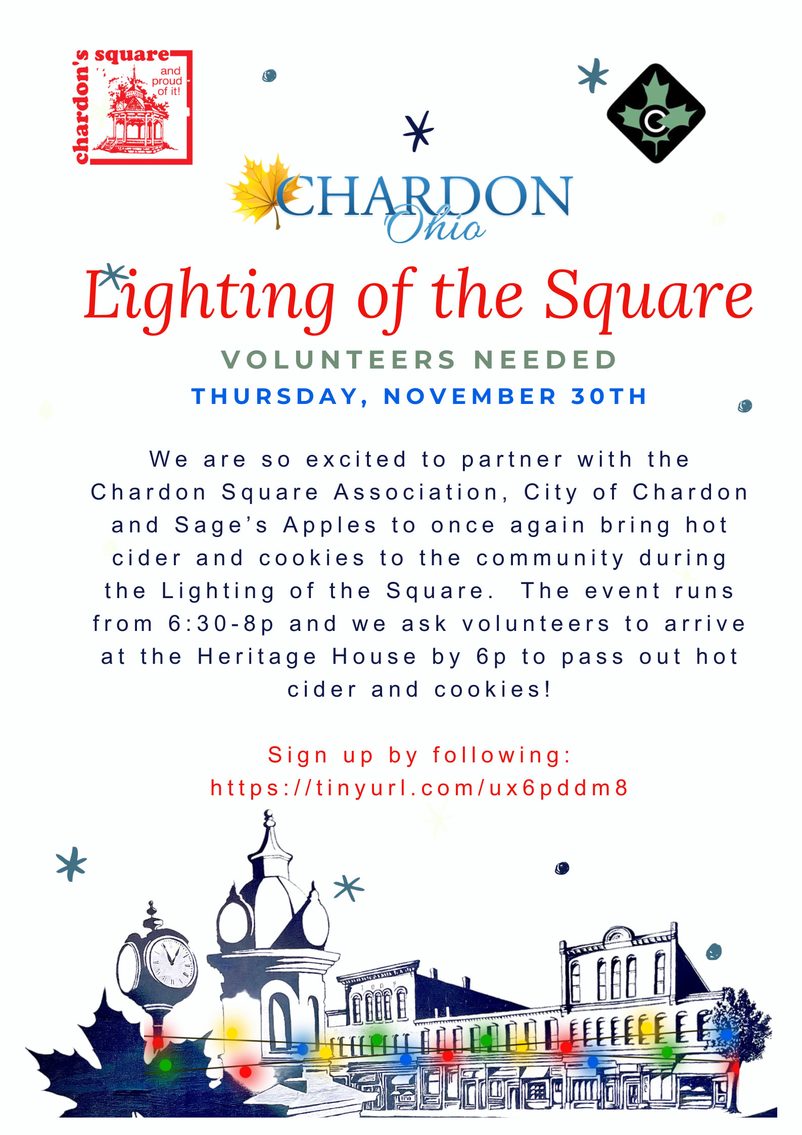 The Chardon Square Association is holding its annual Lighting of the Square on Thursday, November 30th and the Chardon Area Chamber of Commerce will be passing out cookies and hot cider, graciously donated by Sage's Apples.