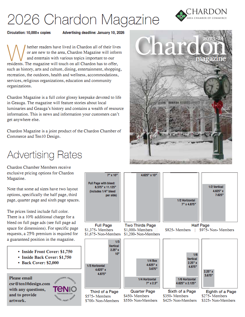 Back to Store Chardon Magazine Advertising Chardon Magazine Advertising Menu Images × $275.00 - $2,000.00 Limited Quantities Available Inside Front Cover - ($1,750.00) Inside Back Cover - ($1,750.00) Back Cover - ($2,000.00) Full Page Chamber Member Price - ($1,375.00) Full Page Non-Member Price - ($1,675.00) 2/3 Page Chamber Member Price - ($1,000.00) 2/3 Page Non-Member Price - ($1,200.00) 1/2 Page Horizontal Chamber Member Price - ($825.00) 1/2 Page Horizontal Non-Member Price - ($975.00) 1/2 Page Vertical Chamber Member Price - ($825.00) 1/2 Page Vertical Non-Member Price - ($975.00) 1/3 Page Horizontal Chamber Member Price - ($575.00) 1/3 Page Horizontal Non-Member Price - ($700.00) 1/3 Page Vertical Chamber Member Price - ($575.00) 1/3 Page Vertical Non-Member Price - ($700.00) 1/4 Page Box Chamber Member Price - ($450.00) 1/4 Page Box Non-Member Price - ($550.00) 1/4 Page Horizontal Chamber Member Price - ($450.00) 1/4 Page Horizontal Non-Member Price - ($550.00) 1/6 Page Vertical Chamber Member Price - ($350.00) 1/6 Page Vertical Non-Member Price - ($425.00) 1/6 Page Horizontal Chamber Member Price - ($350.00) 1/6 Page Horizontal Non-Member Price - ($425.00) 1/8 Page Chamber Member Price - ($275.00) 1/8 Page Non-Member Price - ($325.00) Add To Cart Added to cart × Powered By GrowthZone