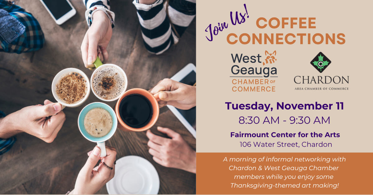 Join us for Coffee Connections! Start your morning with great conversations and new connections at our November Coffee Connections, hosted by the Chardon and West Geauga Chambers of Commerce. Tuesday, November 11 8:30 – 9:30a Fairmount Center for the Arts – Chardon Location 101 Main Street (Upstairs), Chardon Let’s talk turkey about business! Enjoy informal networking with fellow Chamber members while taking part in some Thanksgiving-themed art making. Coffee and light refreshments will be provided — a perfect recipe for a morning of gratitude and great company. This event is free for Chamber members and their colleagues, but space is limited — be sure to register early!Images
