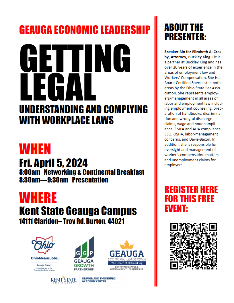 Join Geauga Economic Leadership at Kent State Geauga campus on April 5th for an informative program on Workplace Laws.