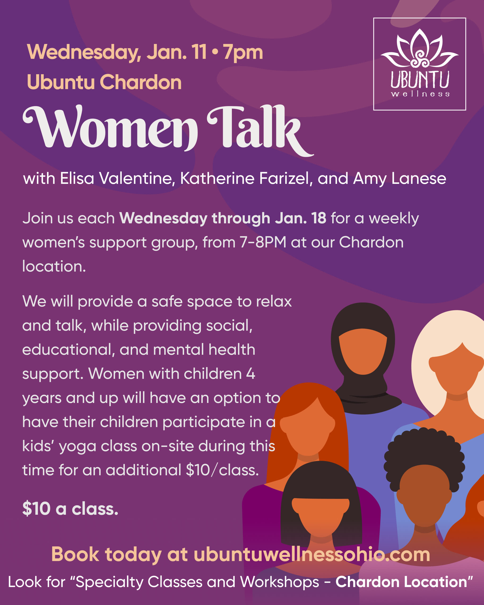 Each Wednesday, through January 18th, Ubuntu will provide a safe space to relax and talk, while providing social, educational, and mental health support. Women with children 4 years and up will have an option to have their children participate in a kids' yoga class on-site during this time for an additional $10/class.