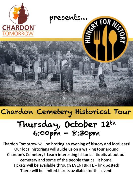 Chardon Tomorrow is excited to host an evening of haunting history and local eats! You will enjoy a historian led walking tour of the Chardon Cemetery and will be presented with local historical tidbits on those that call this space home. To register for this one-time spooky event, please click HERE