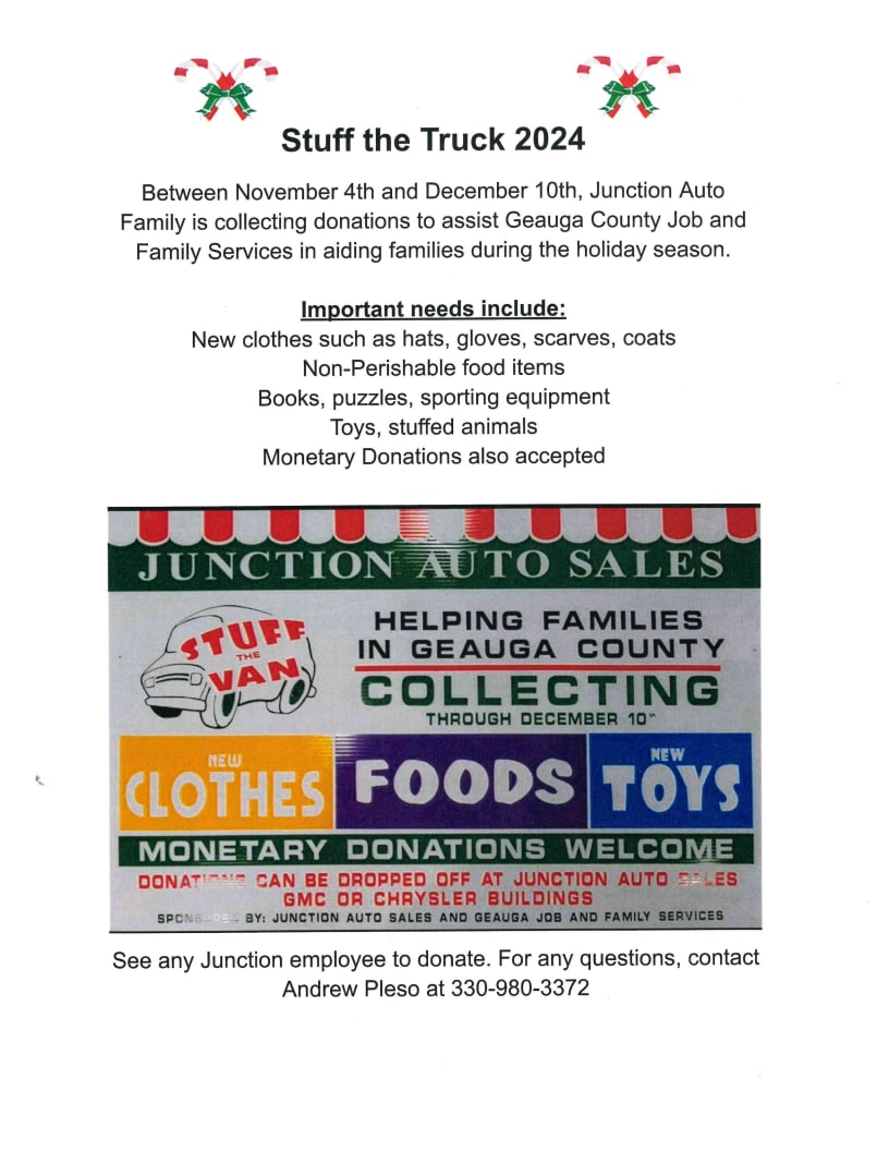 Stuff the Van 2024 has begun! Bring your donations to either the Dodge or GMC buildings at Junction Auto to drop off! We are collecting non-perishable food items, new clothes, and new toys. You can also give us a monetary donation and we will do the shopping for you! Running now through December 10th. All donations will go towards creating a better holiday season for Geauga County families in need!Images