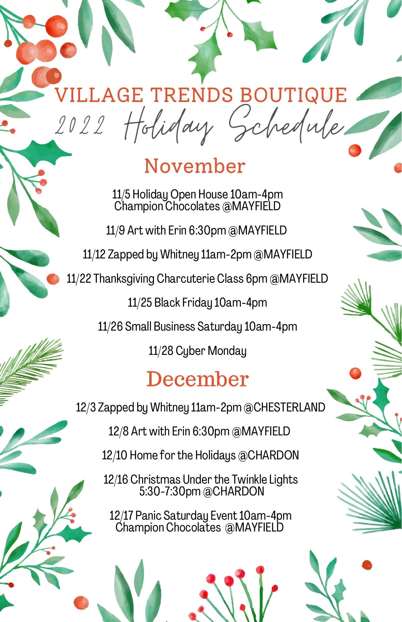 Shop Local, Shop Small every day, and especially during the Holidays, with VTB at their Chardon location! Adorable gifts, clothing, home goods all for the picking. See the attached flyer for all of their Holiday events at their 3 locations!