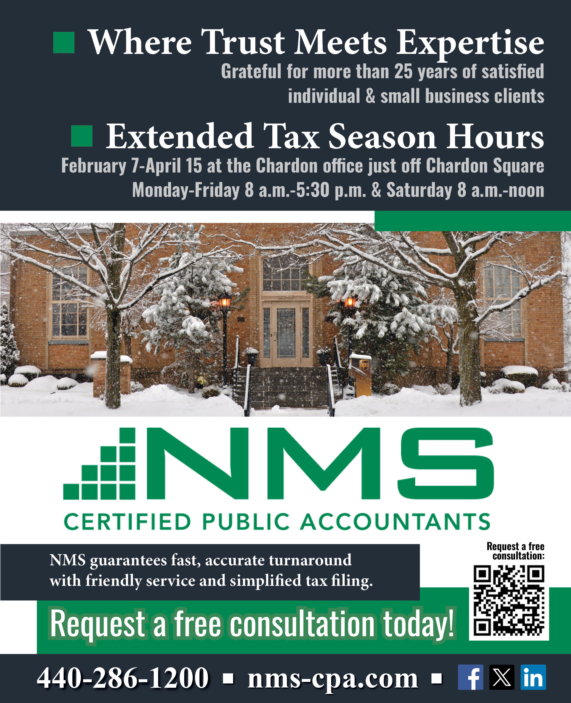 This tax season, trust the expert team at NMS Certified Public Accountants to guide you through every step of your individual or small business return. Located in the historic Ohio Chardon Post office, we are dedicated CPA professionals who truly care about your financial goals, offering personalized, full-service support that's both precise and proactive. NMS' flexible, customizable solutions will combine local service with the professional insight you need to maximize your refund and minimize stress. See what difference we can make for you by requesting a free consultation on our website today!